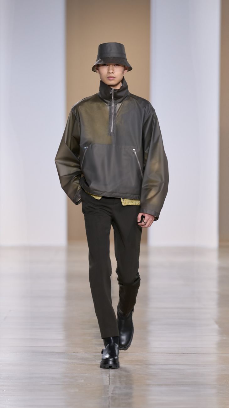 Even as I watched and rewatched the runway walks, I couldn’t bring myself to love the muted chartreuse that became one of the few dashes of color in this collection. The one thing I really felt was out of place was this quarter zip-bucket hat combo with brownish shimmer blotted on.